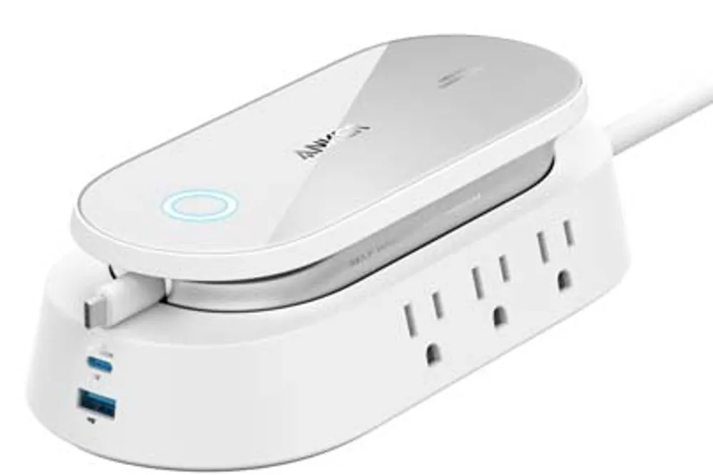 This charging station is specially designed for meeting rooms and includes built-in USB-C cables to provide 60W max (100W total) charging to laptops, phones, and other devices. The USB-C cables are retractable, and the AC outlets are on the side to keep the desk clutter-free. It features a suspended-platform design at the top to give the power strip a futuristic look. The AC outlets are on the side so you can keep power cords out of the way while having simple, clutter-free access to the USB ports and built-in USB-C cables.