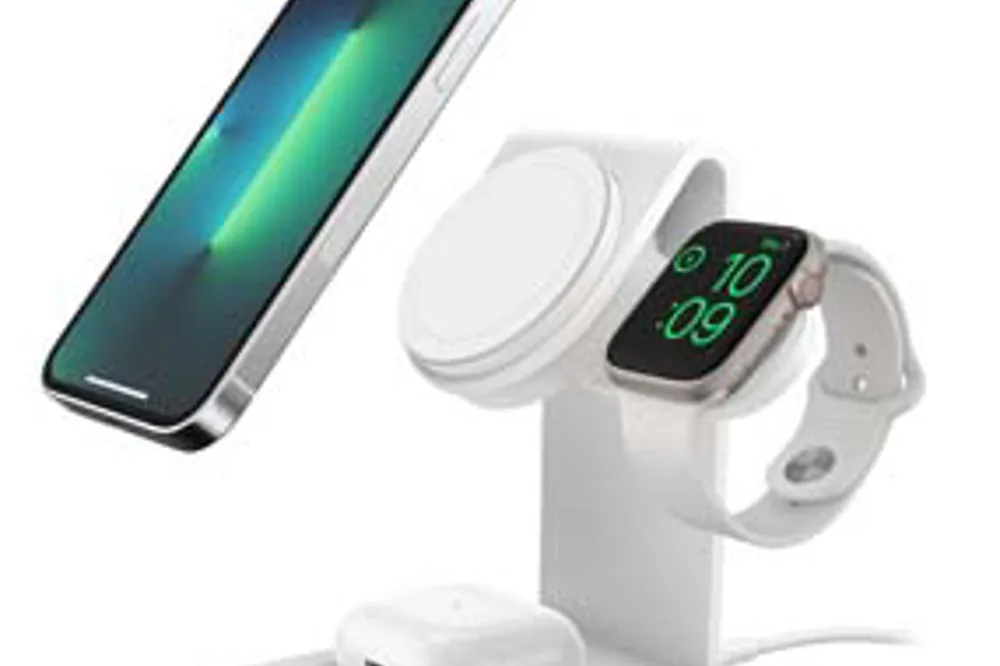 The OtterBox 3-in-1 Charging Station for MagSafe powers all of your Apple mobile devices in one premium, sleek, space-saving stand. Click your iPhone to the wireless MagSafe charging stand; place your AirPods case on the base; and power up your Apple Watch on the integrated sidecar. With a 15W Made for iPhone (MFi)-certified MagSafe module for a fast charge experience, it’s perfect for home and office.