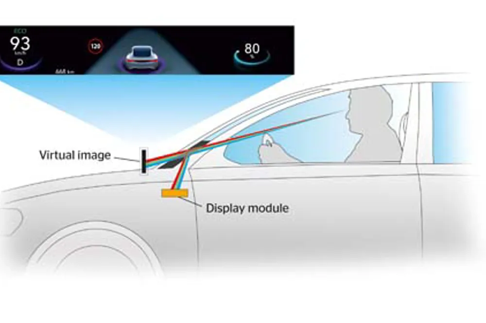 Continental's first Scenic View Head-up Display (HUD) brings information closer to the road and enhances the driving experience. This state-of-the-art solution hides displays inside the dashboard and reflects them onto the lower black band area of the windshield.