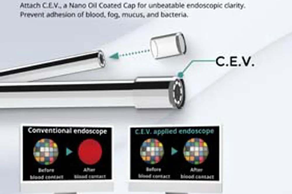 Clear Endo Vision (C.E.V.) is an advanced endoscope cap offering a holistic visibility solution through nano oil film coating technology. Currently, there is no simple method that completely blocks the adhesion of blood, mucus, fogging, and bacteria to endoscope lenses. Consequently, medical experts are required to manually clean the lens during surgery for securing visibility, which can increase surgery time. C.E.V. provides doctors with an unobstructed, clear visual field, eliminating the necessity for frequent lens cleaning. This enhances surgical safety and patient care.