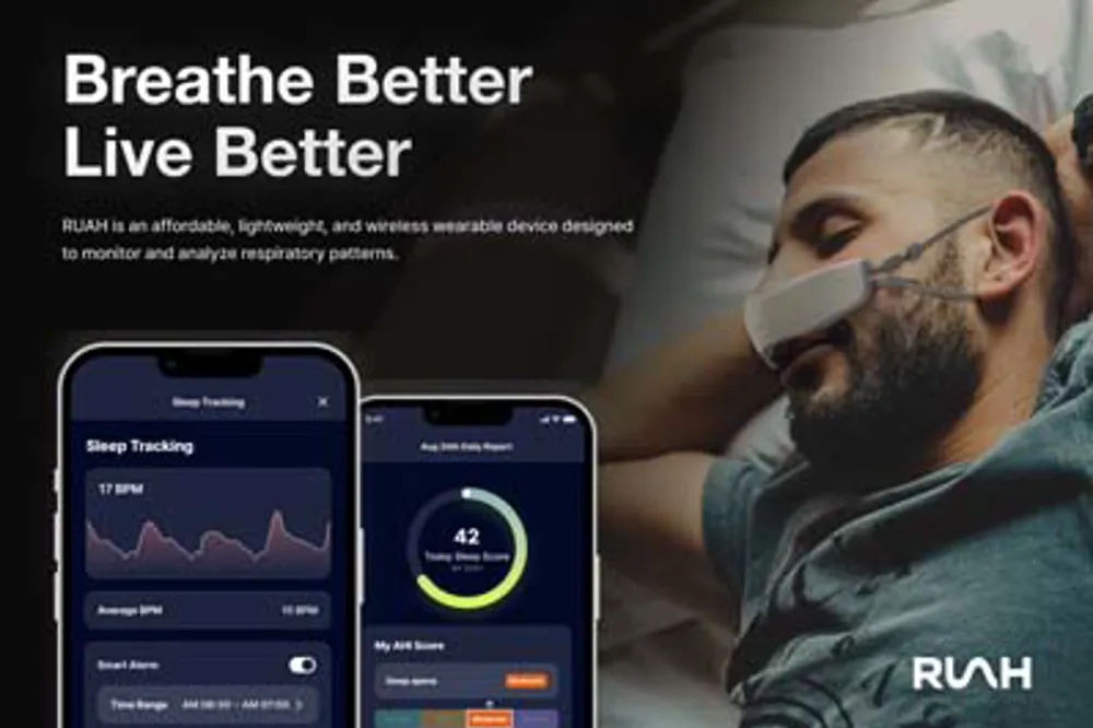 RUAH is an affordable, lightweight, and wireless wearable device designed to monitor and analyze respiratory patterns. Compared to traditional sleep studies like Polysomnography (PSG), which can be both expensive and cumbersome, RUAH provides a budget-friendly option at just 10% of the cost of a typical PSG. Suitable for use anytime and anywhere, it provides the flexibility to continuously track your respiratory health and sleep patterns. Utilizing cutting-edge AI technology, RUAH not only aids in the diagnosis of sleep apnea—a condition affecting nearly one billion people globally—but also offers consistent monitoring to help improve your overall sleep health.