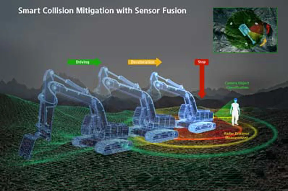 In addition, three wide-angle radar sensors with 180-degree horizontal FOV are used to minimize blind spots and accurately measure the distance of detected objects. When an object is detected within the warning/danger zone, visual/audible warnings are activated, and the excavator reduces the swing and driving speed and then stops them to actively prevent accidents.