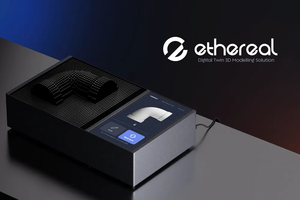 Ethereal suggests a new paradigm of intuitive 3D modelling through a physical digital-twin interface. 3D data can be created as a real-time synced digital twin, directly formed and modified via user input on the physical build plate. The 45x45 array of modular pins that compose the build plate are controlled via a microcontroller and a series of linear actuators to mimic parts of the 3D model's surface. Panning, rotating and zooming the digital twin model through the embedded touch screen in reorientation mode, users can also update the model surface displayed on the screen onto the build plate.