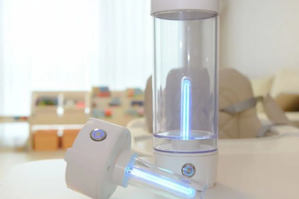 A cap-type UV drinking water sterilizer that fits like a cap on a plastic bottle to sterilize the drinking water in the bottle. A lamp inside the product shines UV-C wavelengths that can destroy 99.9% of bacteria, viruses, and other microorganisms in less than two minutes, providing safe drinking water that can help prevent waterborne illnesses.