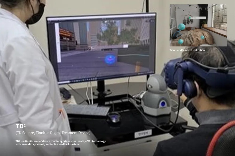 TD2 is a digital therapy device that utilizes cognitive therapy by combining auditory, visual, and tactile feedback systems with virtual reality (VR) technology. Traditional tinnitus treatments are based on medication, which can cause a variety of side effects. By eliminating and controlling tinnitus through AI-generated stereophonic sound in a virtual reality environment, tinnitus symptoms can be relieved.